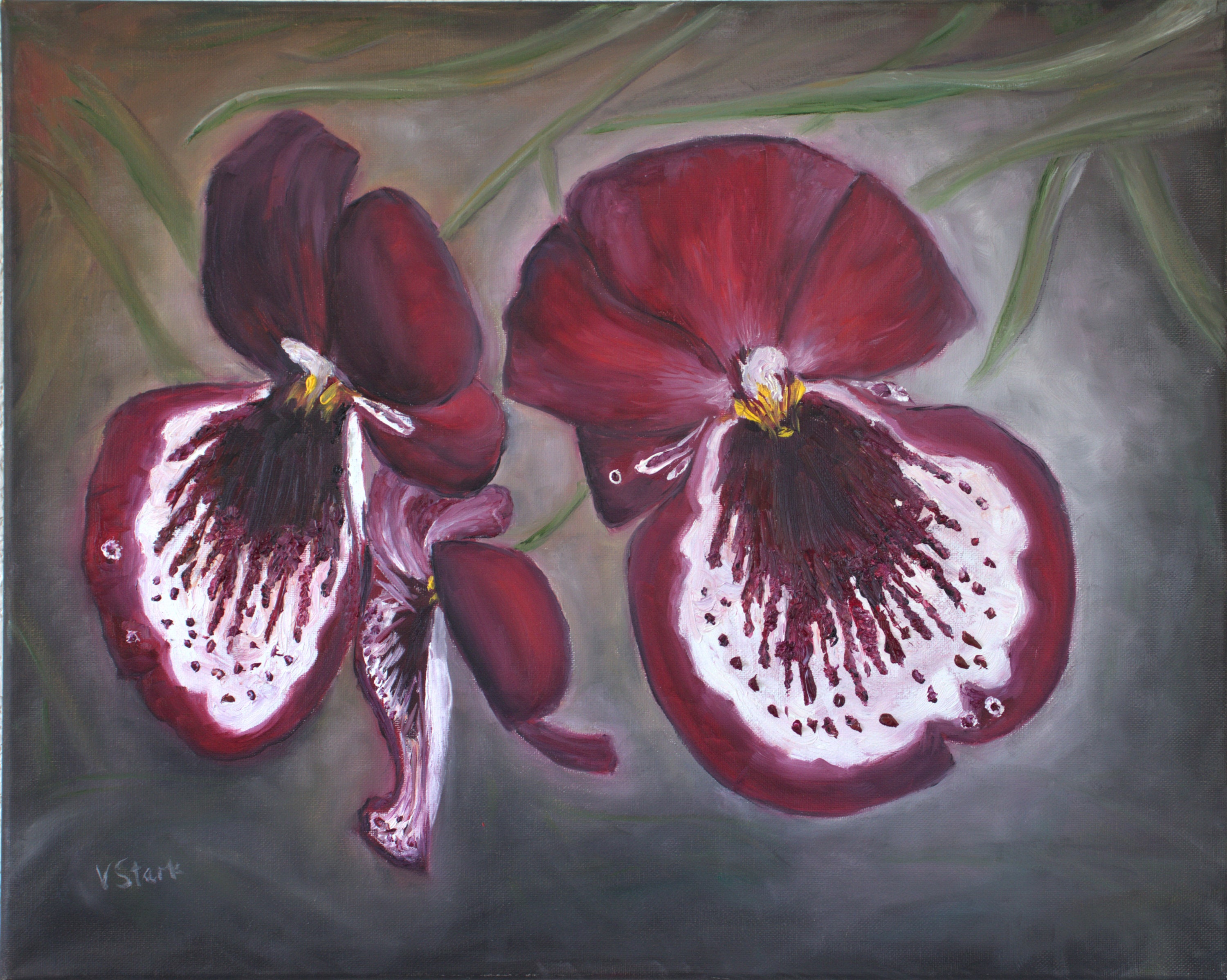 Maroon orchid flowers painting 16 x 20 in. Bold maroon color turns deep red. Three oversized flower heads turn in different directions, which gives an impression of movement. Majestic light around the flowers gives mysterious feeling.