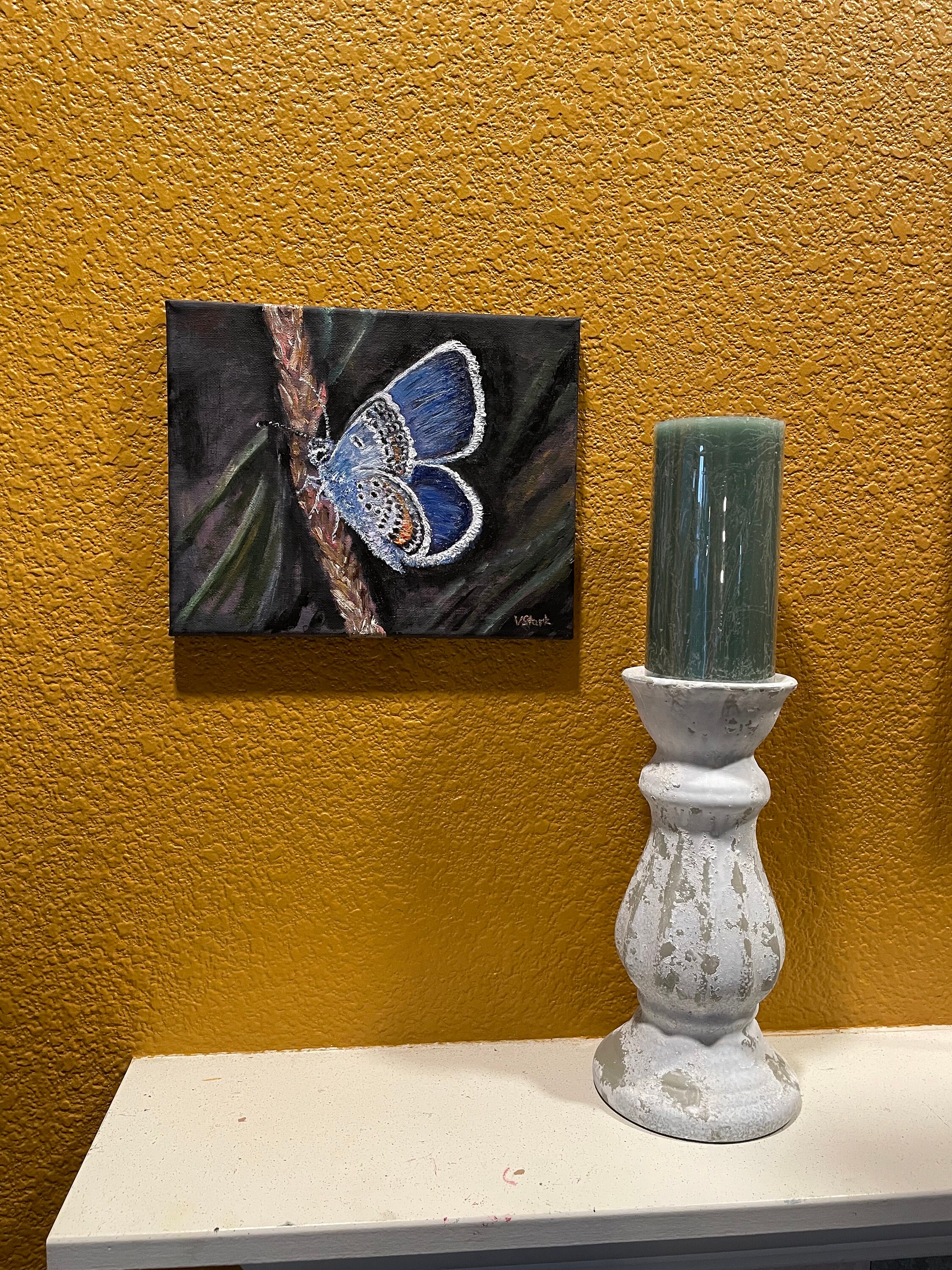 Tiny Blue Butterfly original oil painting is painted with a palette knife and a brush and is 100% handmade. The Melissa Blue Butterfly is a lovely, delicate butterfly found across the United States. This butterfly is native to North America but was introduced to Europe and Asia to control agricultural pests. You can find them in open areas with tall grasses and flowers, such as fields and meadows, as well as in urban areas like parks or gardens. All sides are painted. The signature is available on the front and back of the painting.